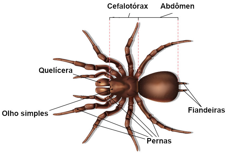 Aracnídeos possuem corpo dividido em cefalotórax (prossoma) e abdômen (opistossoma).