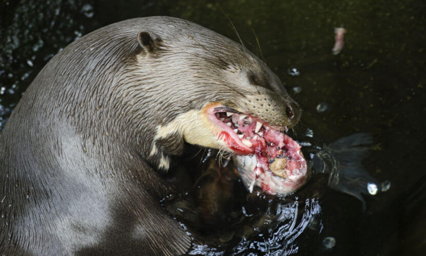 A ariranha é um animal carnívoro que tem os peixes como o seu principal alimento.