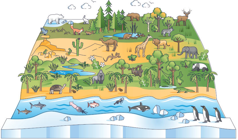 O que devemos considerar, entretanto, é que existem regiões que apresentam maior biodiversidade do que outras. Localidades de climas quentes e úmidos são habitadas por um conjunto maior de seres vivos, da mesma forma que desenvolvem uma ampla variedade de ecossistemas. Por outro lado, regiões de clima frio e árido exibem menor diversidade biológica, e os seres nela presentes desenvolveram adaptações físicas para enfrentarem esses ambientes hostis. Então, as formas de vida da biosfera são indissociáveis do ambiente em que elas estão inseridas. A partir disso, podemos estabelecer uma divisão da biosfera.
