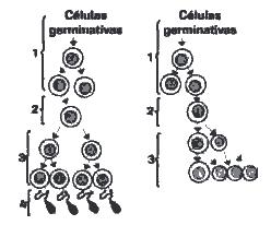 As espermatogônias do tipo A produzem, durante toda a vida do indivíduo, novas espermatogônias, pelo processo de mitose. Essa fase é denominada de fase de multiplicação. Já as espermatogônias do tipo B produzem os espermatócitos pelo processo de meiose. Cada espermatogônia produz um espermatófito.