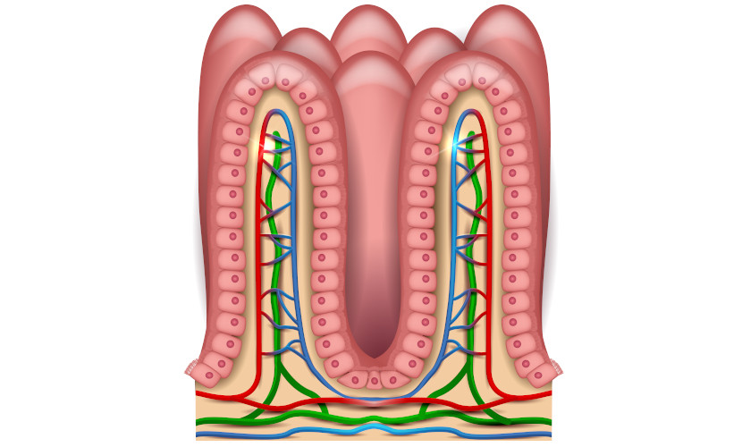 Além da digestão, o intestino delgado, em especial o jejuno e o íleo, atua na absorção dos nutrientes. A absorção é eficiente nesse local, pois a parede intestinal apresenta uma série de dobras chamadas de vilosidades. Além disso, as células possuem também dobras denominadas de microvilosidades. As vilosidades e as microvilosidades garantem um aumento da superfície de contato e promovem uma maior absorção.