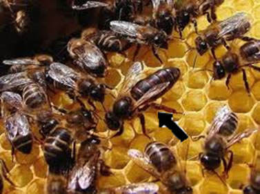 A seta está indicando uma abelha rainha. Note que ela é maior do que as abelhas operárias