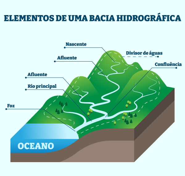 A determinação de uma bacia hidrográfica é feita a partir da identificação de um conjunto de feições e componentes naturais que caracterizam a sua estrutura. Cada um dos elementos de uma bacia hidrográfica desempenha uma função que é de fundamental importância para o bom funcionamento do sistema interno dessa unidade hidrológica. Levando isso em consideração, os elementos de uma bacia hidrográfica são: