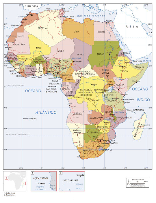 África é um continente de 30,3 milhões de quilômetros quadrados composto por 54 países onde vivem 1,5 bilhão de pessoas. O continente africano se distribui entre os hemisférios norte e sul, além de ter boa parte de sua área situada no hemisfério oeste. Banhado pelos oceanos Atlântico e Índico, a África apresenta tipos de clima contrastantes como o equatorial e o desértico, além de uma vasta vegetação formada por savanas, florestas, estepes e desertos.