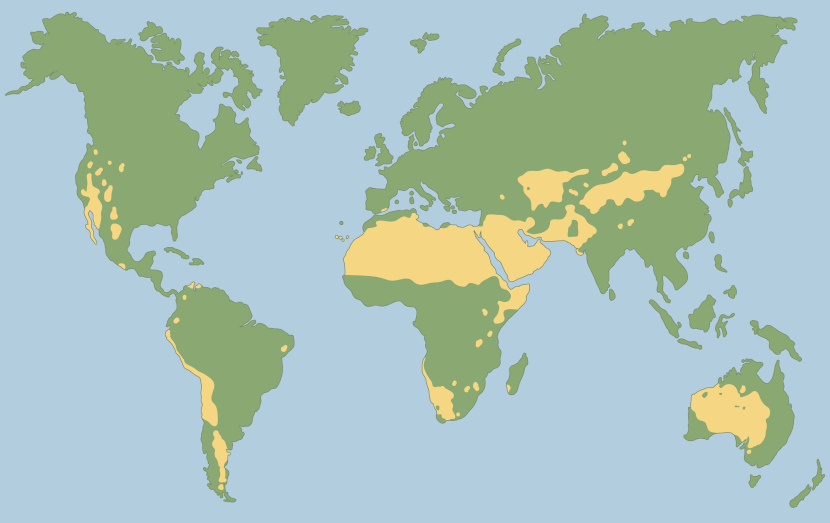 Os desertos são encontrados em todos os continentes do planeta Terra e possuem fisionomia muito diversificada, que varia conforme os fatores naturais e antrópicos atuantes. Aliás, a maioria dos desertos tem ocorrência natural, mas também existem aqueles que se desenvolveram como consequência da ação dos seres humanos no meio ambiente.