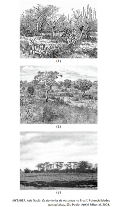 (Fuvest) Os domínios morfoclimáticos e fitogeográficos propostos pelo geógrafo Aziz Nacib Ab’Sáber nos anos 1960 continuam válidos na atualidade. Representam um mapeamento do território brasileiro, na escala zonal, onde foram identificados seis grandes domínios, além de uma faixa denominada de transição, que sintetizam os elementos do clima, da vegetação, do solo, do relevo e outros atributos presentes na paisagem. Observe as imagens: