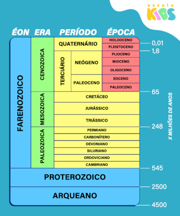 A escala de tempo geológico pode ser dividida em quatro diferentes eras, as quais descrevemos na sequência.