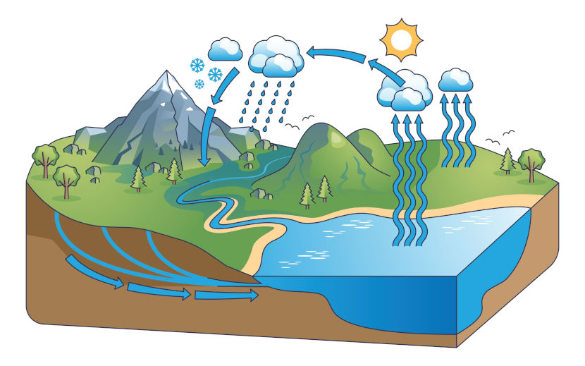 O ciclo hidrológico e, portanto, os processos que acontecem na hidrosfera são: