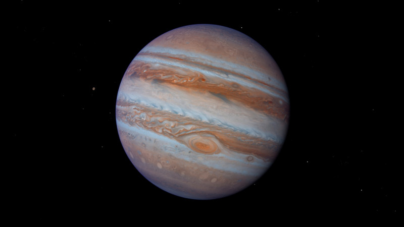 Júpiter ocupa a quinta órbita a partir do Sol, e fica entre Marte e Saturno. Apresenta mais de dez vezes o tamanho do planeta Terra, e fica a aproximadamente 780 milhões de quilômetros de distância do Sol. Júpiter possui um núcleo interno sólido, formado de ferro e silicatos, cujas temperaturas podem se aproximar de 50.000º C. Ao redor desse núcleo estão líquidos e gases que se mantêm nesse estado por conta da elevada pressão atmosférica.