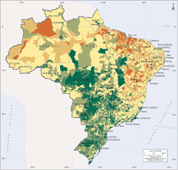 O mapa a seguir é um mapa econômico, e apresenta o PIB per capita dos municípios brasileiros no ano de 2019:
