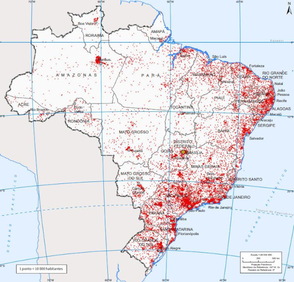 O mapa a seguir é um tipo de mapa demográfico, e mostra a distribuição da população brasileira no território nacional em 2022: