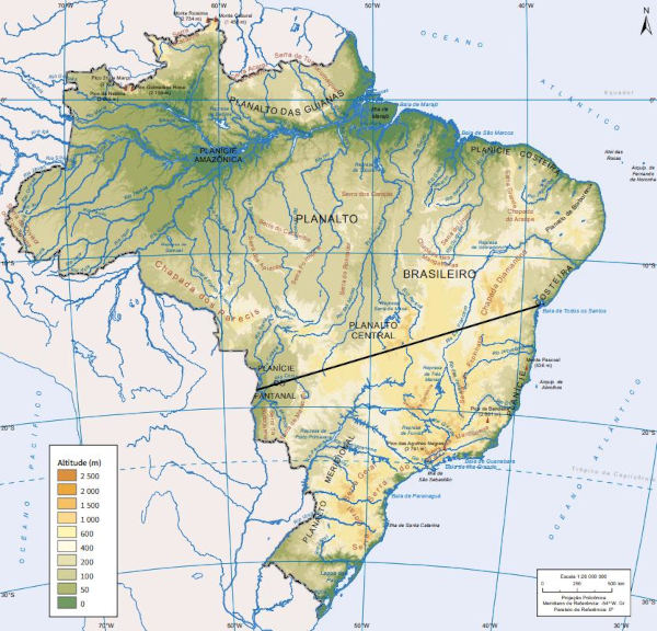 Há, também, o mapa de relevo do Brasil que indica a altitude média de cada área: