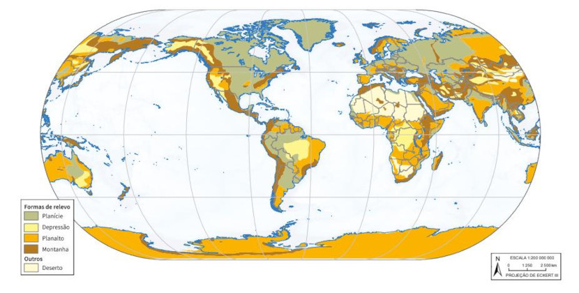 O mapa a seguir representa as formas de relevo em escala mundial: