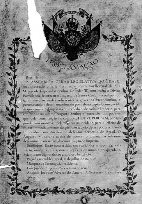 A Constituição de 1824 estipulava que a maioridade do monarca ocorreria aos 18 anos, mas, em meio a um contexto de instabilidade, com revoltas regionais e disputas entre facções políticas, os liberais pressionaram para que Dom Pedro II, então com apenas 14 anos, fosse declarado maior de idade e coroado imperador.