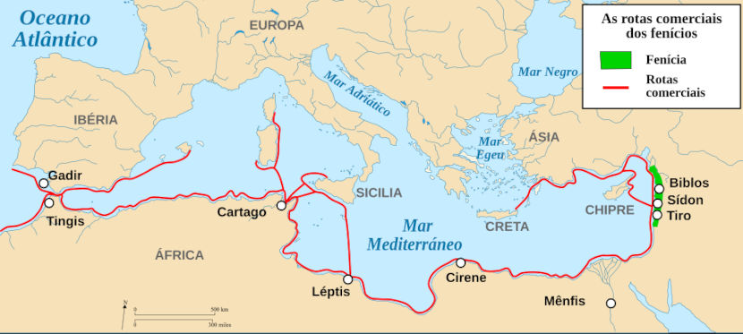Abaixo está um mapa da Fenícia, para que possamos identificar sua localização, bem como as rotas marítimas que eles mantinham.