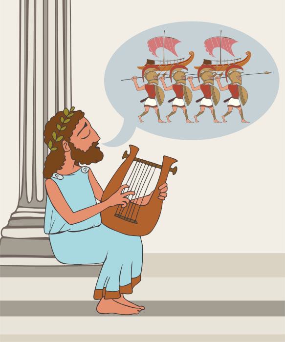 2 - “A Ilíada e a Odisseia são, certamente, fruto de uma longa tradição oral em que os poetas (chamados aedos) declamavam os episódios da guerra de Troia e as aventuras de Odisseu. Esses relatos eram cantados acompanhados por música, e passados de geração em geração, tendo sofrido muitas alterações e adaptações. Só mais tarde, cerca de 550 a.C., os poemas foram escritos pela primeira vez.”