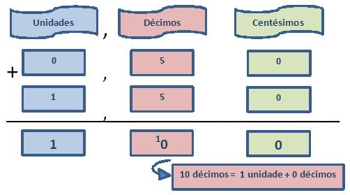 Você ainda se lembra de que o sistema numérico é um sistema baseado no número 10, não é mesmo? Vemos isso quando somamos 10 unidades, e estas 10 unidades podem ser chamadas de 1 dezena. Ao fazermos isto com os números decimais, não é diferente. Dê uma relembrada, olhando o artigo de Números Decimais, assim você entenderá melhor como somar estes números.