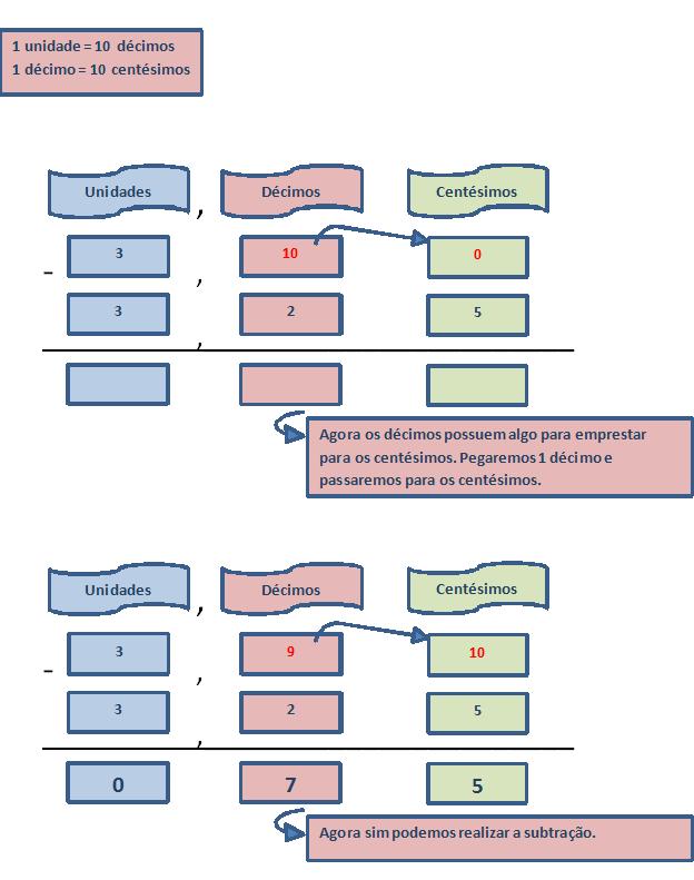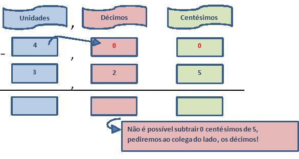 Mas veja que os décimos também não têm nada para emprestar para os centésimos. No entanto, como eles são muito amigos, os décimos irão até as unidades ver o que eles podem conseguir.
