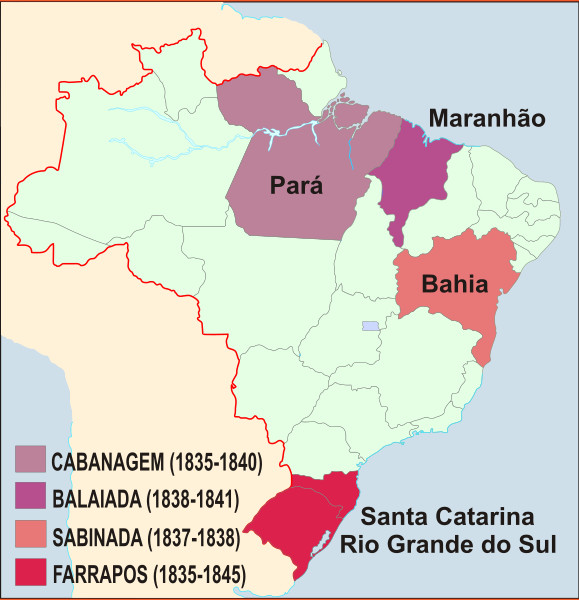 Guerra dos Farrapos: em 1835, os grandes estancieiros do Rio Grande do Sul estavam descontentes com os altos impostos que pagavam sobre a comercialização de charque e com os desmandos da regência na região. Em 1835 se iniciou a guerra civil com os gaúchos tomando boa parte das regiões do Rio Grande do Sul e posteriormente de Santa Catarina, que passaram a chamar de República Juliana. Durante dez anos as tropas farrapas se mantiveram em combate e consideraram as regiões dominadas como território independente do Brasil. Em 1845 o conflito terminou com um acordo no qual o governo de Dom Pedro II se comprometeu a reduzir os impostos sobre o charque, dar mais autonomia para a província e a perdoar os líderes da revolta.