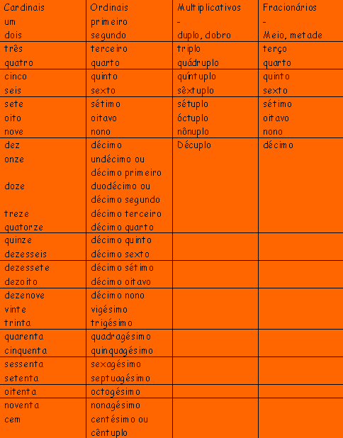 Para facilitar mais o nosso entendimento, conheceremos uma lista com os principais tipos de numerais: